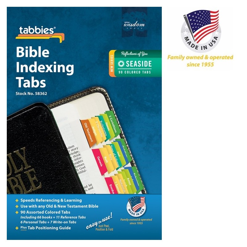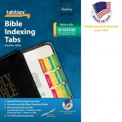 Tab any size Bible to find any book of the Bible faster. Pre-cut, permanent self-adhesive tabs, including Positioning Guide. Names of books are printed on both sides for easy reading and quick reference. TABBIES is family owned and operated since 1955. Made in USA