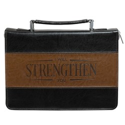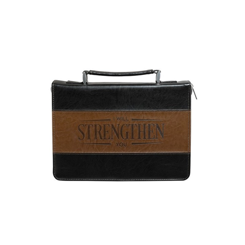An inspirational, nurturing message is displayed across the front of the "I Will Strengthen You" Two-tone Bible Cover - softly debossed into the tan, full grain faux leather band. On the back, the band carries the skilfully engraved text of Isaiah 41:10.
