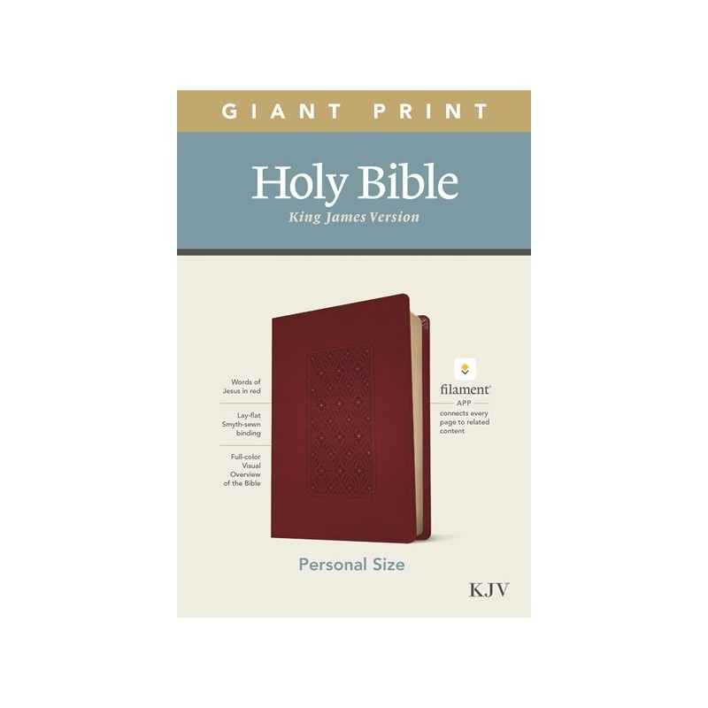 Bible Reading: IlluminatedThe new Tyndale KJV Personal Size Giant Print Bible, Filament-Enabled Edition, has readable text and an attractive layout in an easy-to-carry size. And while it has the same low price as basic, text-only Bibles, the KJV Personal Size Giant Print Bible offers much more. Along with the trusted and revered King James Version (KJV) text, it also includes the groundbreaking Filament Bible app, which turns this Bible into a powerful study and devotional experience, offering more to expand your mind and touch your heart than you can possibly hold in your handat no additional cost, no additional bulk or weight. Read this Bible on its own, or dig deeper with the Filament Bible app. Use your mobile phone or tablet to connect every page to a vast array of related content, including:25,000 study notes350+ videos40+ maps and infographics400+ profiles and articles1,500+ devotionalsLibrary of worship musicSpecial features include:New, easy-to-read page designsFilament content linked to every page!Readable large printHandy thin sizeWords of Jesus in redQuality lay-flat Smyth-sewn bindingTyndale Verse FinderPresentation pageRibbon markerGilded page edges