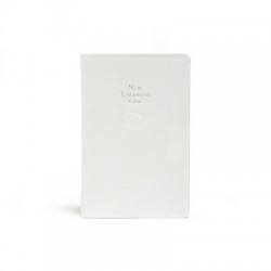 Small, gift-boxed KJV New Testament for baby in imitation white leather.