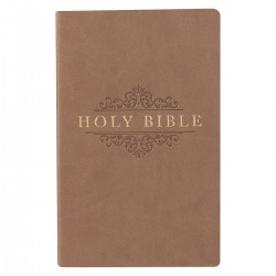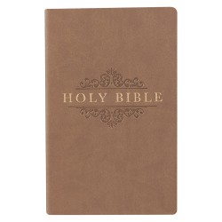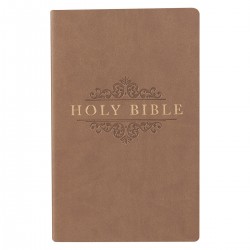 Our Economy Thinline Taupe Flexcover Edition of the King James Bible is constructed with quality man-made material with the look and feel of real leather (trade name LuxLeather). The front cover has a debossed design with gold foil titling on the front and spine. Inside, you'll find a double-column format, a helpful Scripture verse finder by topic and a one-year Bible reading plan. 738 Pages. Text Size 8pt 5 1/4 x 8 1/4 x 7/8 Inch Faux Leather Flexcover Bound Lay-Flat Spine Unique Scripture Verse Finder One-Year Bible Reading Plan