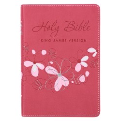 This sweet pink King James Version Pocket Edition will charm women of all ages. Its cover is constructed of quality man-made material imported from Italy, with the look and feel of real leather (trade name LuxLeather). Design features include debossed cover title and motifs with silver foil accents, and silver gilt-edged pages. Inside, you'll find a helpful Scripture verse finder, reader-friendly subheadings, a double-column format, a one-year Bible reading plan and an attached ribbon page marker. Our handy pocket-sized edition Bibles are easy to slip into a purse, pocket or backpack. Also perfect for the nightstand.