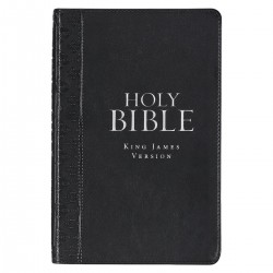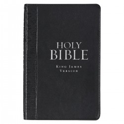 Striking Black Faux Leather Bound King James Bible. The cover is constructed of quality man-made material imported from Italy, with the look and feel of real leather (trade name LuxLeather). Design features include a debossed tiled pattern on the spine and back cover, silver foiled debossed title, silver gilt-edged pages with thumb indexing and an attached ribbon page marker. Inside, you'll find reader-friendly subheadings, a double-column format, words of Christ printed in red ink, a helpful Scripture verse finder by topic and a one-year Bible reading plan. 1002 Pages.
