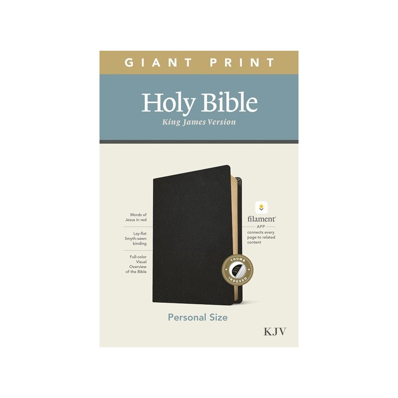 Bible Reading: IlluminatedThe new Tyndale KJV Personal Size Giant Print Bible, Filament-Enabled Edition, has readable text and an attractive layout in an easy-to-carry size. And while it has the same low price as basic, text-only Bibles, the KJV Personal Size Giant Print Bible offers much more. Along with the trusted and revered King James Version (KJV) text, it also includes the groundbreaking Filament Bible app, which turns this Bible into a powerful study and devotional experience, offering more to expand your mind and touch your heart than you can possibly hold in your handat no additional cost, no additional bulk or weight. Read this Bible on its own, or dig deeper with the Filament Bible app. Use your mobile phone or tablet to connect every page to a vast array of related content, including:25,000 study notes350+ videos40+ maps and infographics400+ profiles and articles1,500+ devotionalsLibrary of worship musicSpecial features include:New, easy-to-read page designsFilament content linked to every page!Readable large printHandy thin sizeWords of Jesus in redQuality lay-flat Smyth-sewn bindingTyndale Verse FinderPresentation pageRibbon markerGilded page edges