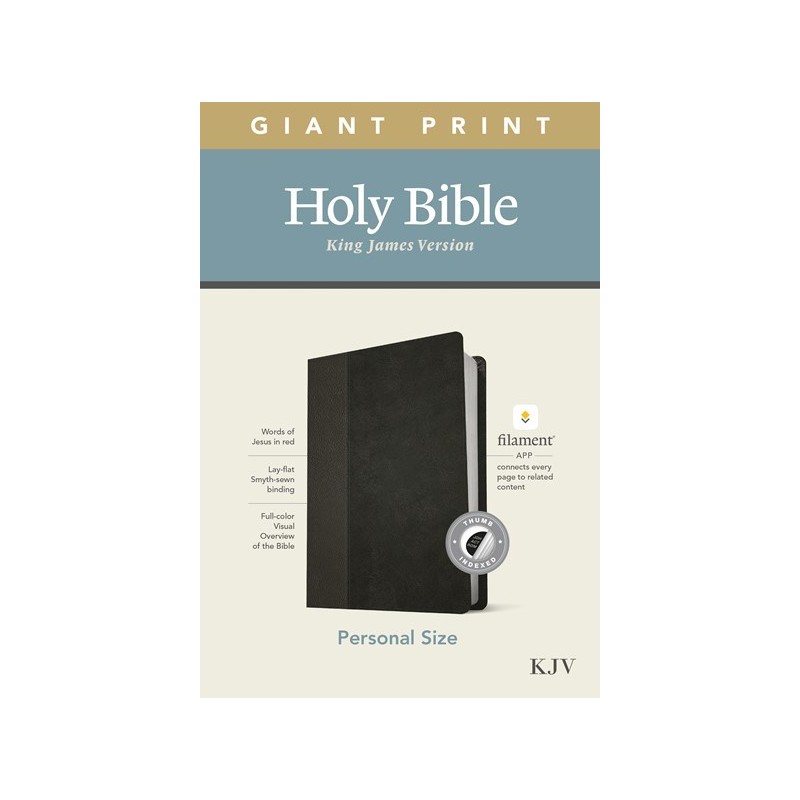 Bible Reading: IlluminatedThe new Tyndale KJV Personal Size Giant Print Bible, Filament-Enabled Edition, has readable text and an attractive layout in an easy-to-carry size. And while it has the same low price as basic, text-only Bibles, the KJV Personal Size Giant Print Bible offers much more. Along with the trusted and revered King James Version (KJV) text, it also includes the groundbreaking Filament Bible app, which turns this Bible into a powerful study and devotional experience, offering more to expand your mind and touch your heart than you can possibly hold in your handat no additional cost, no additional bulk or weight. Read this Bible on its own, or dig deeper with the Filament Bible app. Use your mobile phone or tablet to connect every page to a vast array of related content, including:25,000 study notes350+ videos40+ maps and infographics400+ profiles and articles1,500+ devotionalsLibrary of worship musicSpecial features include:New, easy-to-read page designsFilament content linked to every page!Readable large printHandy thin sizeWords of Jesus in redQuality lay-flat Smyth-sewn bindingTyndale Verse FinderPresentation pageRibbon markerGilded page edges