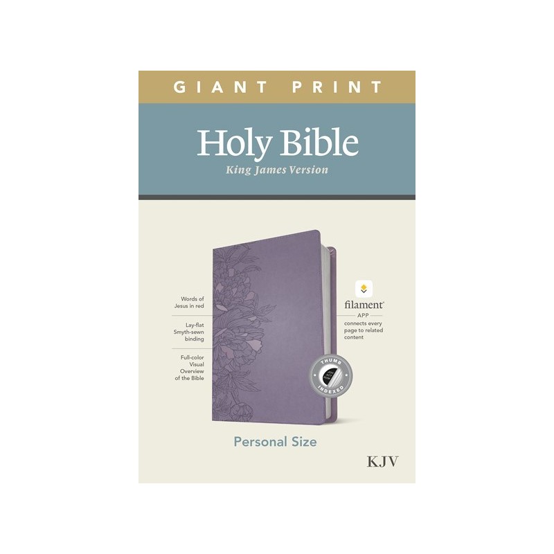 Bible Reading: IlluminatedThe new Tyndale KJV Personal Size Giant Print Bible, Filament-Enabled Edition, has readable text and an attractive layout in an easy-to-carry size. And while it has the same low price as basic, text-only Bibles, the KJV Personal Size Giant Print Bible offers much more. Along with the trusted and revered King James Version (KJV) text, it also includes the groundbreaking Filament Bible app, which turns this Bible into a powerful study and devotional experience, offering more to expand your mind and touch your heart than you can possibly hold in your handat no additional cost, no additional bulk or weight. Read this Bible on its own, or dig deeper with the Filament Bible app. Use your mobile phone or tablet to connect every page to a vast array of related content, including:25,000 study notes350+ videos40+ maps and infographics400+ profiles and articles1,500+ devotionalsLibrary of worship musicSpecial features include:New, easy-to-read page designsFilament content linked to every page!Readable large printHandy thin sizeWords of Jesus in redQuality lay-flat Smyth-sewn bindingTyndale Verse FinderPresentation pageRibbon markerGilded page edges