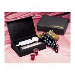 Value Features Include: Each portable communion set contains 25 disposable cups in a reusable plastic sleeve, container for juice, container/server for communion bread. Packaged in a heavy-duty cardboard box, wrapped in a leather look paper with padded cover and magnetic closure. Outside top of box reads "In Remembrance" in gold foil stamp Portable set is perfect for pastors and other persons with responsibility for taking communion shut ins, hospital patients, and other unable to attend traditional worship services.