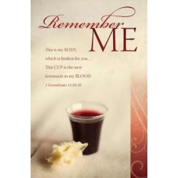 Remember Me communion bulletin features a bread piece and communion juice cup with the Scripture verse: This is my Body, which is broken for you...This Cup is the new testament in my BLOOD. 1 Corinthians 11:24-25 (KJV). The bulletin is shown folded (8.5" x 5.5"), exactly as church members and visitors will receive it. The back side is blank to include the information you choose. Worship bulletins arrive packaged flat 8.5" x 11" to fit into your printer or copier; shrink wrapped in packages of 100.