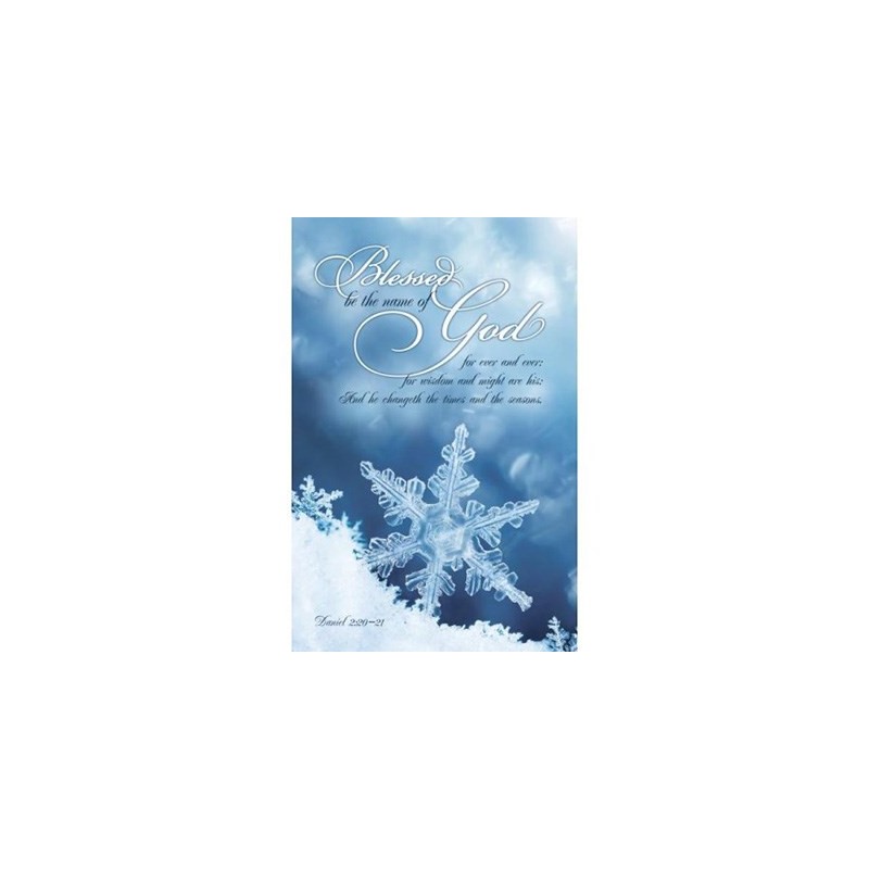 Blessed Be the Name (Daniel 2:20-21, KJV) regular size bulletin features winter scenery and the Scripture verse: Blessed be the name of God for ever and ever: for wisdom and might are his: And he changeth the times and the seasons. Daniel 2:20-21 (KJV). The bulletin is shown folded (8.5" x 5.5"), exactly as church members and visitors will receive it. Worship bulletins arrive packaged flat 8.5" x 11" to fit into your printer or copier shrink wrapped in packages of 100.