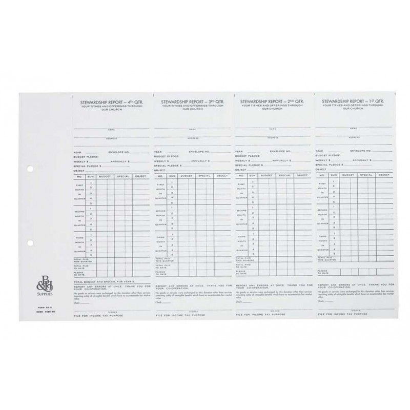 Quarterly reports show the amount paid to the regular budget and any special accounts. Used with carbon (not included), the original is mailed to church members and the duplicate remains as permanent church record. Includes IRS statement SR11. Each report measures 3" x 8.5".