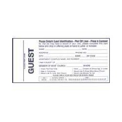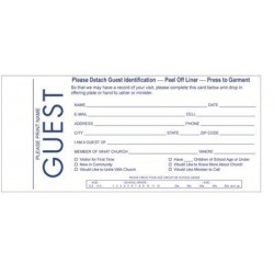 Guest card features space for personal information (front) and includes a warm welcome (back). Measures 5" x 2.75". Detachable name tag is adhesive and measures 2.75" x 1.5". Package of 100.