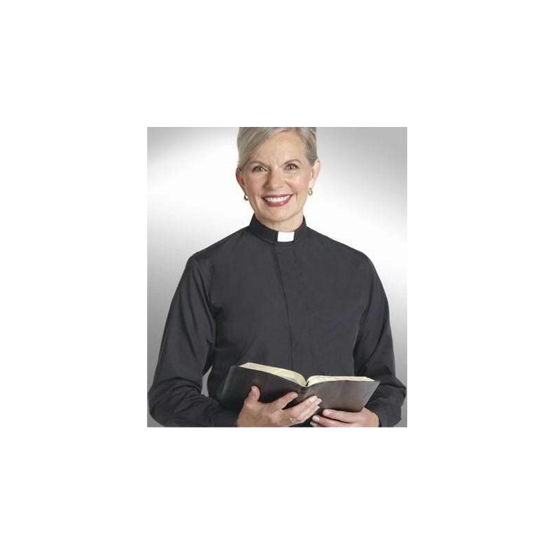 This black long-sleeved clergy shirt is tailored for women with feminine touches. Ready to ship next business day.