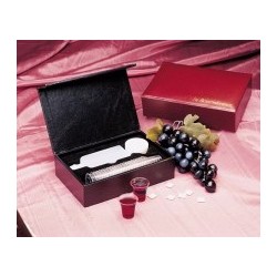 Value Features Include: Each portable communion set contains 25 disposable cups in a reusable plastic sleeve, container for juice, container/server for communion bread. Packaged in a heavy-duty cardboard box, wrapped in a leather look paper with padded cover and magnetic closure. Outside top of box reads "In Remembrance" in gold foil stamp Portable set is perfect for pastors and other persons with responsibility for taking communion shut ins, hospital patients, and other unable to attend traditional worship services.
