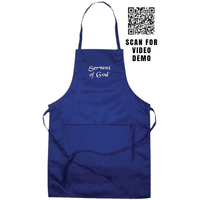 Royal blue adjustable sliding apron Servant of God Embroidered w/white thread