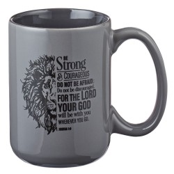 This gray Joshua 1:9 Coffee Mug is made of ceramic. The image of a lion is also displayed on the left side of the Bible verse on the ceramic coffee mug.