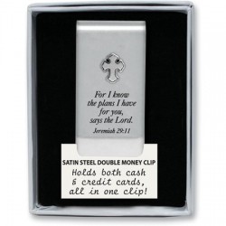 Cross money clip of satin steel features double clip to hold both cash and credit cards. Approximately 2"; with Scripture verse from Jeremiah 29:11 For I know the plans I have for you, says the Lord. Boxed for giving; practical gift keepsake.
