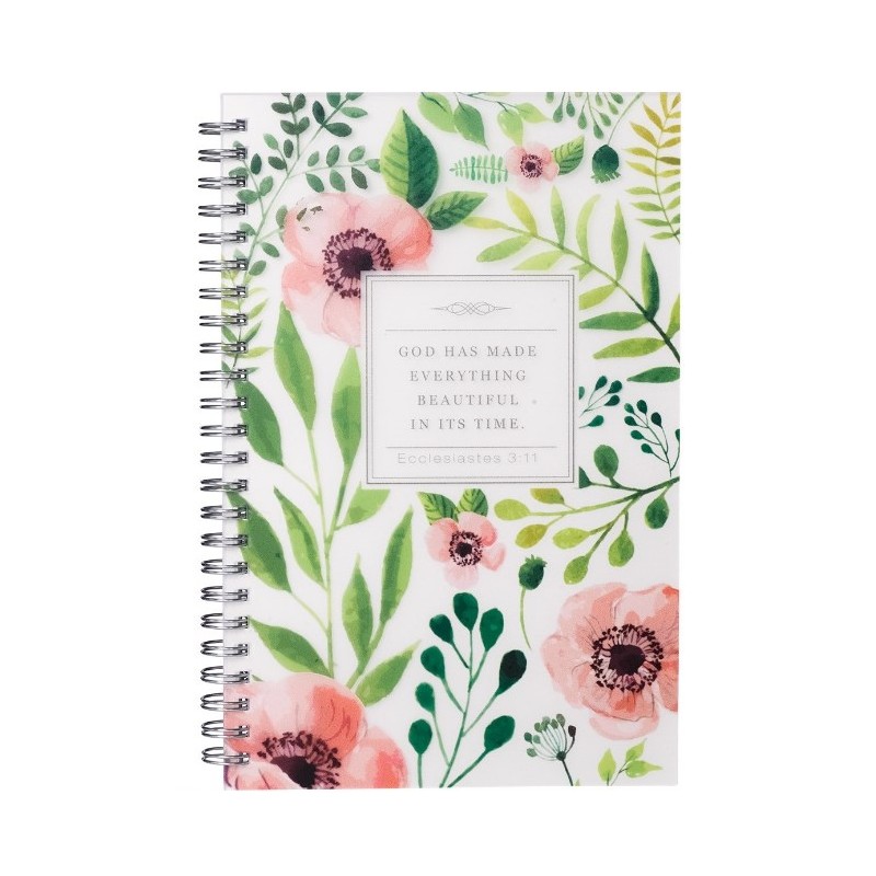 This lined notebook with captivating botanic artwork that highlights text paraphrased from Ecclesiastes 3:11, "He has made everything beautiful in its time," printed on the flexible and translucent PVC cover is bound with a 5/8 inch coil. Each notebook page carries Scripture from Psalm 118:29, "Give thanks to the Lord, for He is good; His love endures forever."