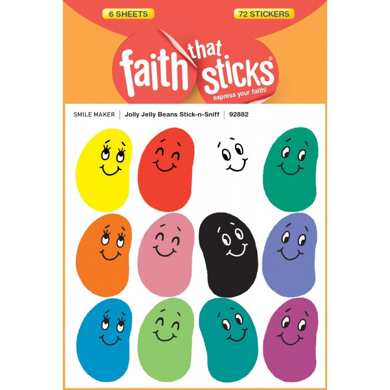 Jelly bean shapeswith a jelly bean smell! These Stick-n-Sniff stickers appeal to kids of all ages, and they make a great reward or candy gift for Easter without the sugar! Smiling faces on each bean just add to the fun. Approximately " x 1" each, each sheet holds 12 unique colors and shapes. Six sheets, 12 stickers per sheet; 72 stickers per package.