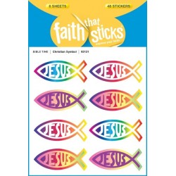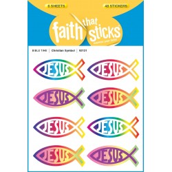 These large, colorful stickers of the Christian fish symbol (Ichthus) are embellished with the name Jesus at the center. This symbol of faith was first adopted by Christians in the early church. Use them as rewards or reminders of the fact that Jesus was a fisher of men. Approximately 1" x 1" each. Six sheets, 8 stickers each per sheet; 48 stickers per package.