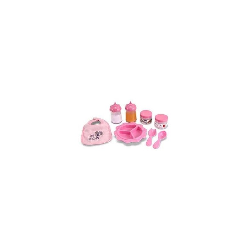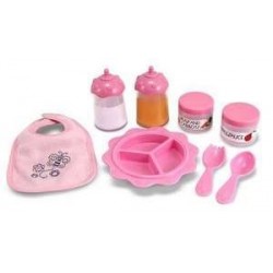Every mommy knows how important it is to feed a little baby. Now, your little mommy can take care of her baby with this adorable 8-piece set. An easy-close, embroidered bib, keeps baby clean during mealtime which is organized with a divided dish, fork, spoon and yummy "applesauce" and "peas and carrots" for the baby. Disappearing "orange juice" and "milk" bottles add nutrition and fun!