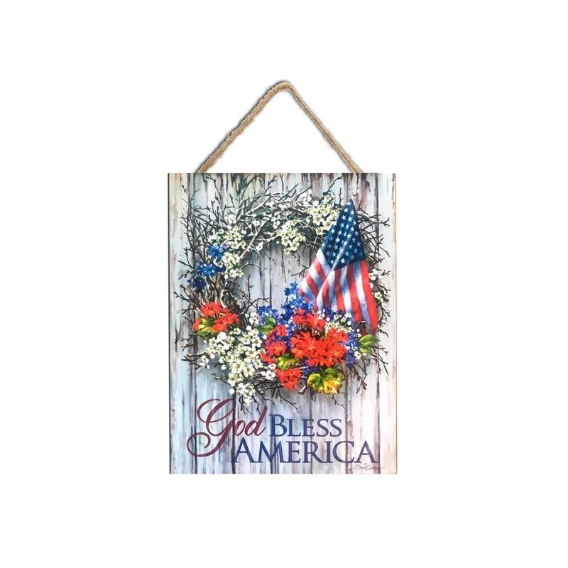 Celebrate the USA with this patriotic God Bless America 7.5"x10" Sign. Designed by artist Dona Gelsinger. It's easy to hang with the attached heavy duty twine rope. This makes a perfect gift! For indoor use. Measures 7.5"x10"x3/8"
